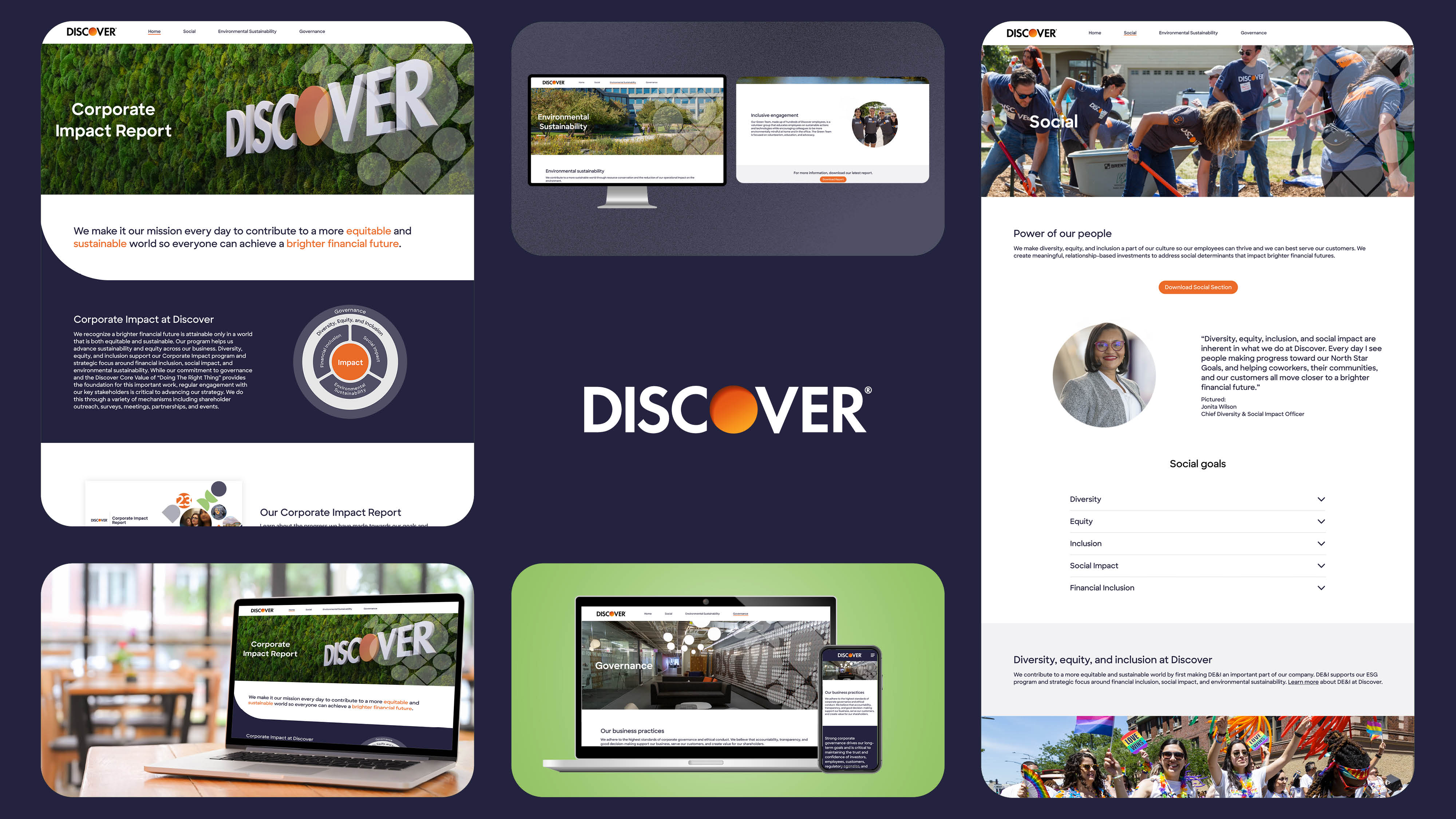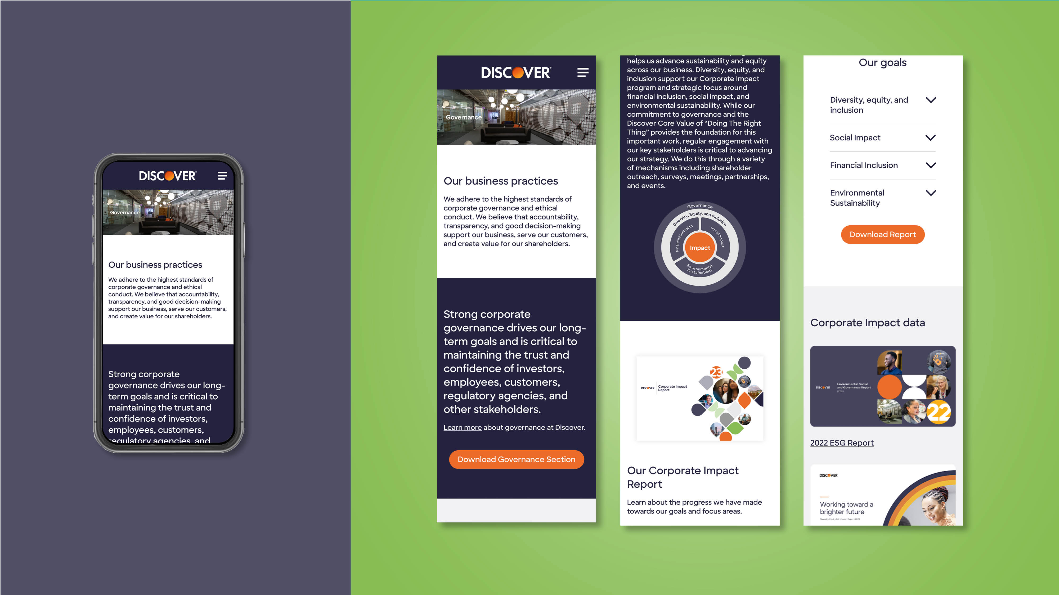 Website design for Discover's Corporate Impact Report, translating report data into a clear, accessible digital format that helps users easily navigate and understand key insights.